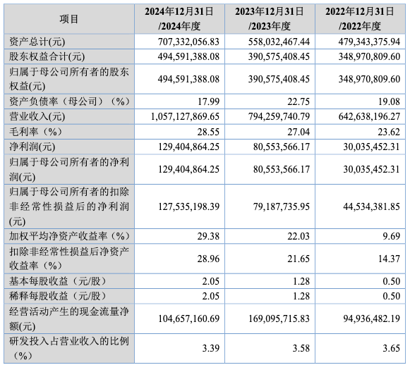 业绩方面,据巴兰仕IPO上会申报稿显示,2022年至2024年(以下称“报告期”),营业收入分别为6.43亿元、7.94亿元和10.57亿元,同比增幅分别为-13.61%、23.59%、33.10%;归母净利润分别为3003.55万元、8055.36万元及1.29亿元,同比增幅分别为-50.41%、168.19%、60.64%。近两年,公司经营业绩总体呈高速增长态势。