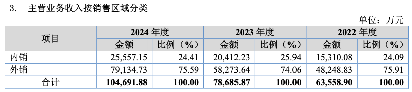 报告期内,公司主营业务收入主要来源于外销,外销主要为贴牌模式,公司外销收入占比分别为75.91%、74.06%和75.59%,外销收入增长率分别为20.78%、35.80%,公司称主要系其产品在欧洲等国外市场的性价比优势进一步显现。同时,报告期,公司汇兑收益分别为165.35万元、123.45万元和521.61万元。