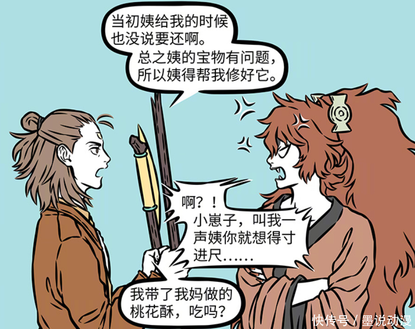 杨戬耍赖,表示当初西王母给他的时候,并没有说要还。杨戬不管那么多,总之开山斧是坏了,西王母就要帮他修好。西王母更加生气,如果不是云花的女儿,西王母可能就出手了。不过杨戬也是能拿捏西王母,带来了母亲做好的桃花酥,还问她要不要吃。