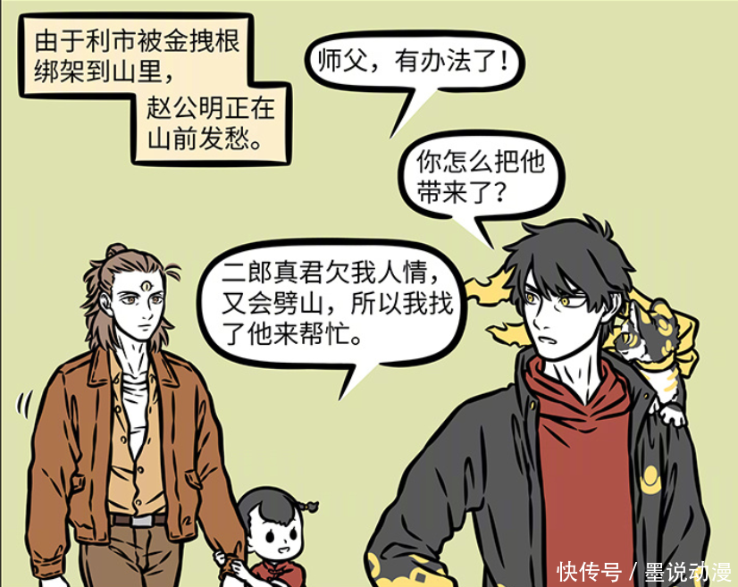 金拽根算是《非人哉》一大反派,经常绑架别人。这一次不是金蟾被绑架,而是利市被绑架。想救利市,赵公明有点下不了手,招财去请杨戬过来。从情况来看,杨戬似乎还欠了招财一个人情,加上他能劈山,所以让他过来最合适。